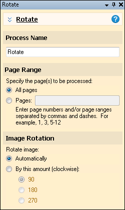 The Rotate image enhancement automatically or manually rotates an image in 90 degree increments (i.e., 90, 180, or 270 degrees). Rotating the image ensures the accuracy of OCR, which expects images to be right side up. OCRing an upside down image will produce unreadable text.