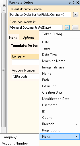 If Laserfiche Capture Engine is not configured in this way, the Capture Engine tokens will not be accessible from the token button menu, because a repository could potentially contain so many fields that it would be difficult to display them all in Quick Fields. If you are using Laserfiche Capture Engine but not retrieving documents by template or field, you can still use Capture Engine tokens by entering them manually. The syntax for a Capture Engine token is %(Field.Fieldname). Note that this is subtly different from a Quick Fields field token (Quick Fields token syntax is plural: %(Fields.Fieldname)