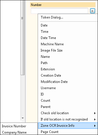 Once a process that extracts information is configured, you can use the tokens generated by the process to configure document properties. When you click the token button (right arrow), the name of the process you configured (such as "Zone OCR Invoice Info") will appear in the menu. When you select it, another menu will open showing all the tokens associated with that process. Select one of these tokens to insert it in a field, document name, or folder path. When the documents are scanned, the tokens will be replaced with the values extracted by the process.