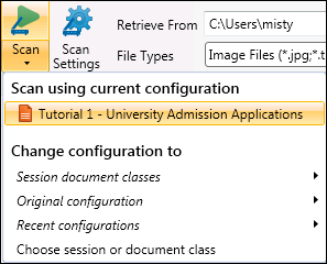 - Recent configurations: If you experiment with different document classes and sessions to identify and process your scanned documents, you will be able to view and select a recent document class or session you selected.