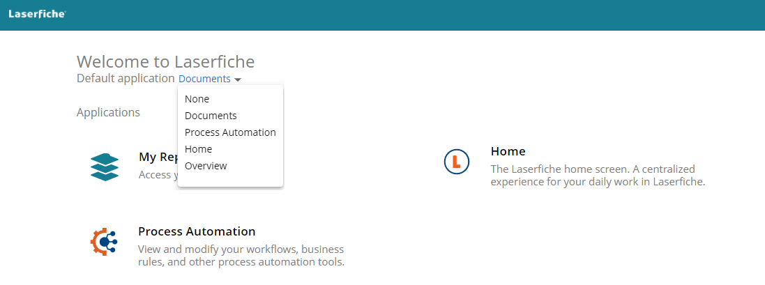 Default application, choose your desired application. When you sign in to Laserfiche Cloud, you will be automatically redirected to the selected application. For example, to be automatically redirected to your Laserfiche repository, select the Documents option.