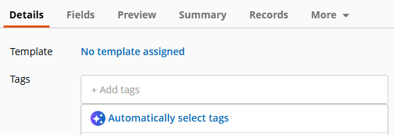 When viewing the metadata pane for a document, on the Details tab, when you choose to add a tag, the Automatically select tags option instructs Laserfiche AI to automatically assign any eligible tags.