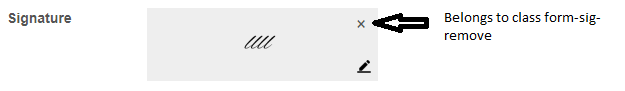We want the Submit button to be hidden again if the user deletes the signature. So we add another function that hides the submit button when x in the signature box for an existing signature is clicked. We find that this x has the class form-sig-remove, so we trigger the function when an element with class form-sig-remove is clicked.