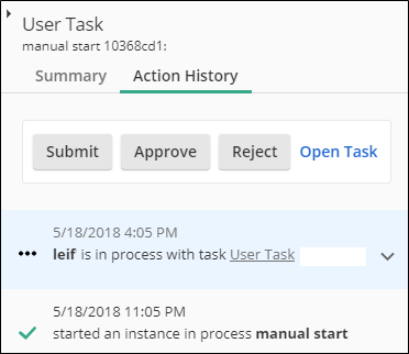 In the Action History tab, you can see when the various stages of the instance happened and which user or team is responsible for that stage. For a completed task, the time of completion is also shown.