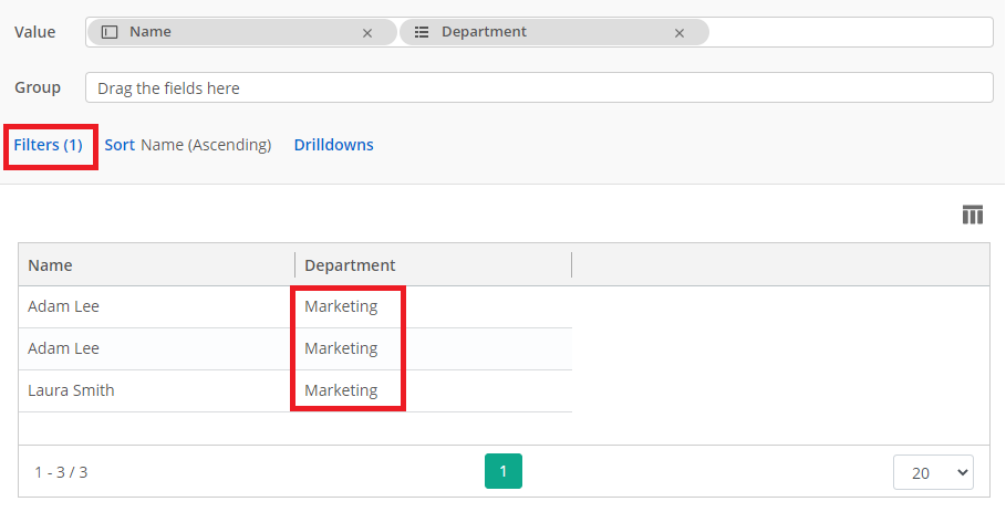 In this example, we'll filter the custom report data to show only a list of names and departments of people in Marketing.