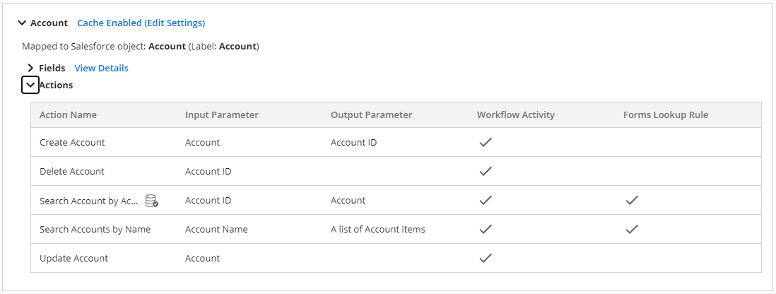 The Actions area displays what actions can act upon the object, and which Laserfiche Cloud applications have access to the actions. If object caching has been enabled, a database icon will be displayed next to the action name that will use the cached data.