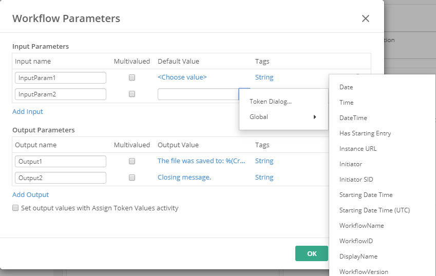 - When checked, the values defined here can be over-written by using an Assign Token Values activity, and the output values will be visible as tokens within the workflow.