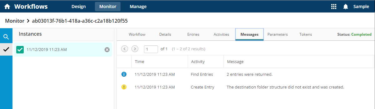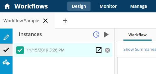 Click Recent Activity on the Design page to view the latest workflow activity on the Monitor page..
