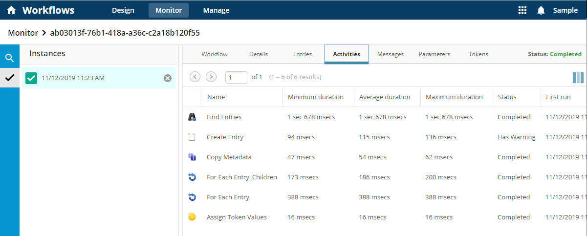 Activities: View a list of each activity, activity duration, workflow duration, status, and more. Provides a more detailed view of each activity's performance than the Details section allowing for a more granular view. -
