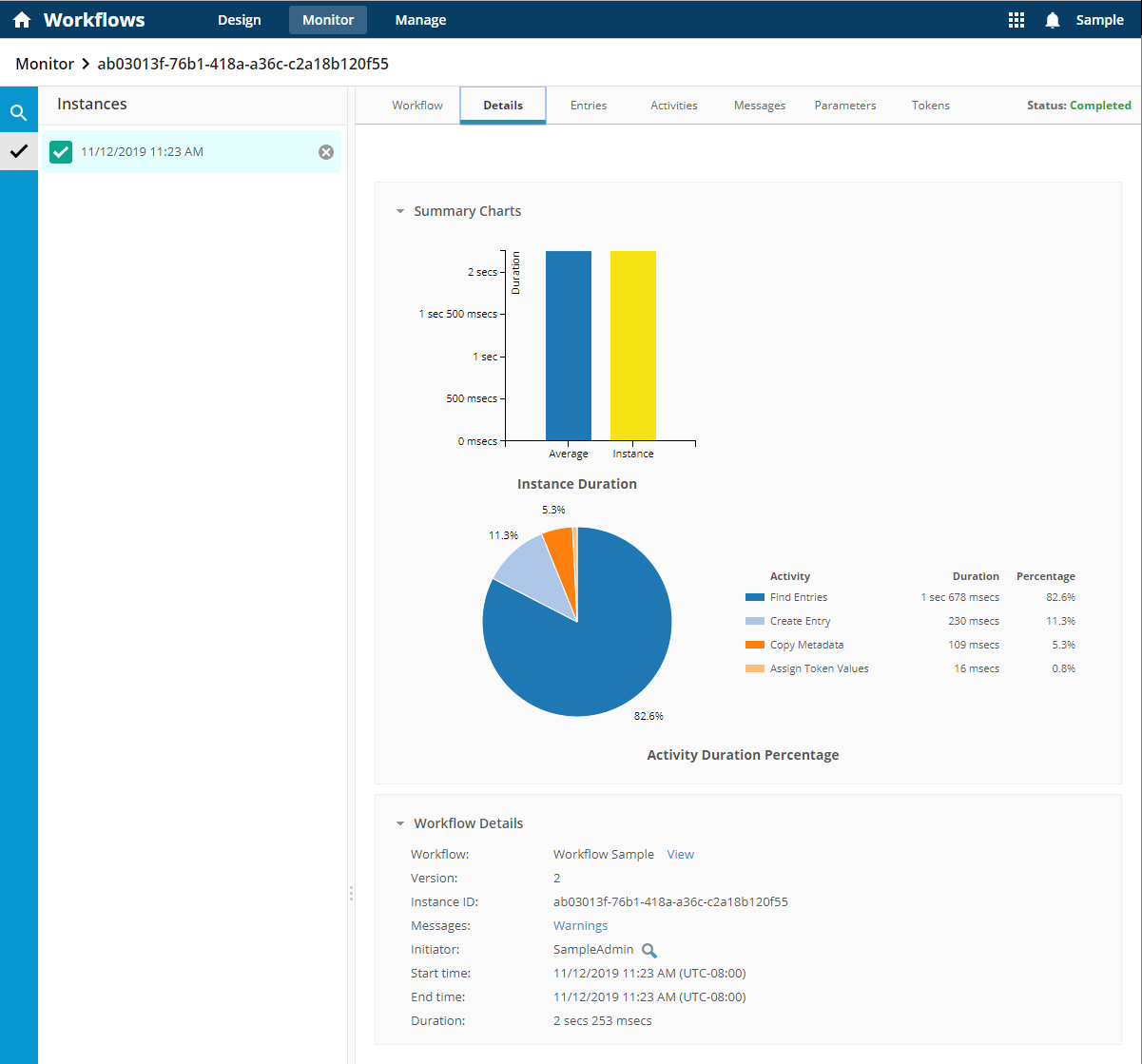 You can interpret the progress and performance of your workflow instances using the instance reporting feature in the Instances tab. This report is available on the Monitor and Design pages. From the navigation bar on the Monitor page, you can easily find any instance report using the nearby search feature, while from the navigation bar on the Design page, you can easily navigate between the associated workflow definition and the instance report.