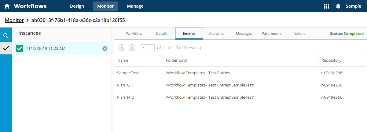 Entries: View the entries used, along with each entry's folder path and repository. Provides for verification that processes are acting on the right entries, or verification that desired entries are not missed in processing. -