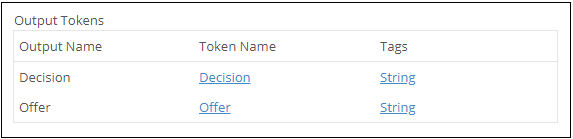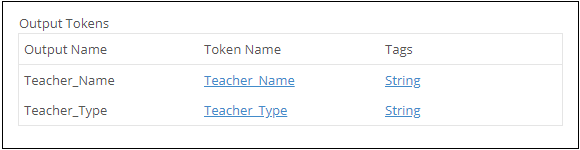 - Under Output Tokens, specify the name and tag of the single-value token that contains the result of the rule. The output values presented here correspond to the Output Parameter column in the SELECT section of the data query.