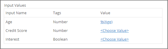Example: In the following image, the input name Age represents the input field on the Output Order decision table. When the activity runs, the value of the %(Age) token is entered for the input.