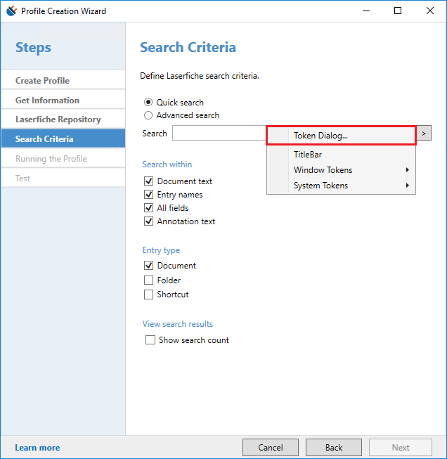 - If you are gathering information from another application, you can create tokens in the Get Information step of the Profile Creation wizard. On this page, tokens are created for all the controls you capture and for all the zones you OCR in the application.